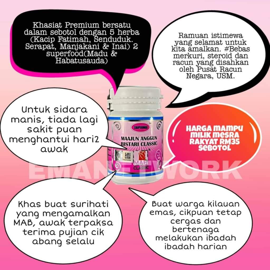Sep 03 2019 Kini bonda buka kembali ruang dan peluang kepada puan-puan semua untuk merasai khasiat akar kayu herba yang 100 asli dalam bentuk maajun iaitu MAAJUN ANGGUN BISTARI MAB. Jul 30 2010 Tidak benar. Hanya serendah RM21 sebotol sahaja.